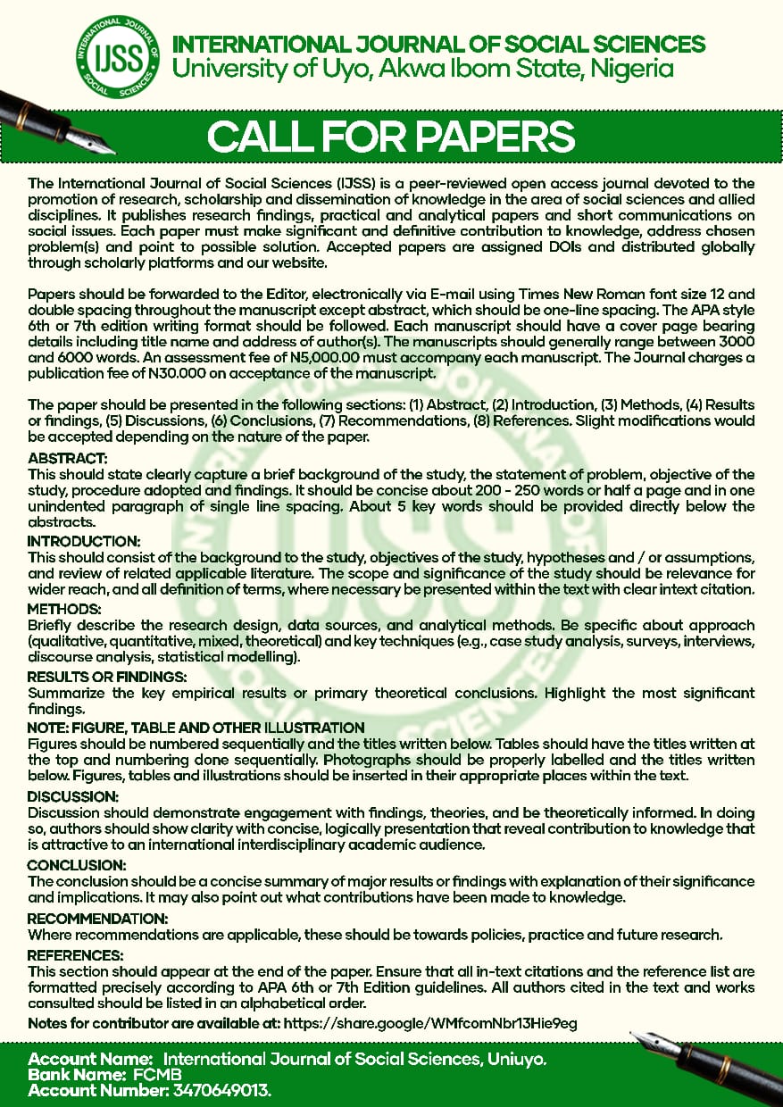 International Journal of Social Sciences was established in 1998. Up till the year 2013, it was published twice a year. However, beginning from this year 2016, the journal has assumed a new status as a quarterly journal being published in March, June, September and December. The journal is actively collaborated with international scholarship particularly in the United Kingdom and the USA. The journal aims at promoting research both in the Social Sciences and its cognates. It will continue not only to publish research findings and articulate position papers from academics but also provide a forum for exchange of views between the various Social Science disciplines and cognates as well as with policy makers and executives concerned with the human phenomenon.